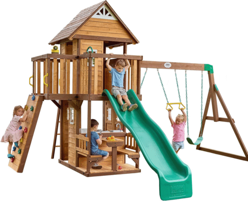 2.) If you have a few more dollars to spend, then we recommend the Backyard Discovery SkyFort. This playset is extremely popular with children of all ages because it features a tube slide and an elevated crow’s nest that they love to climb into.